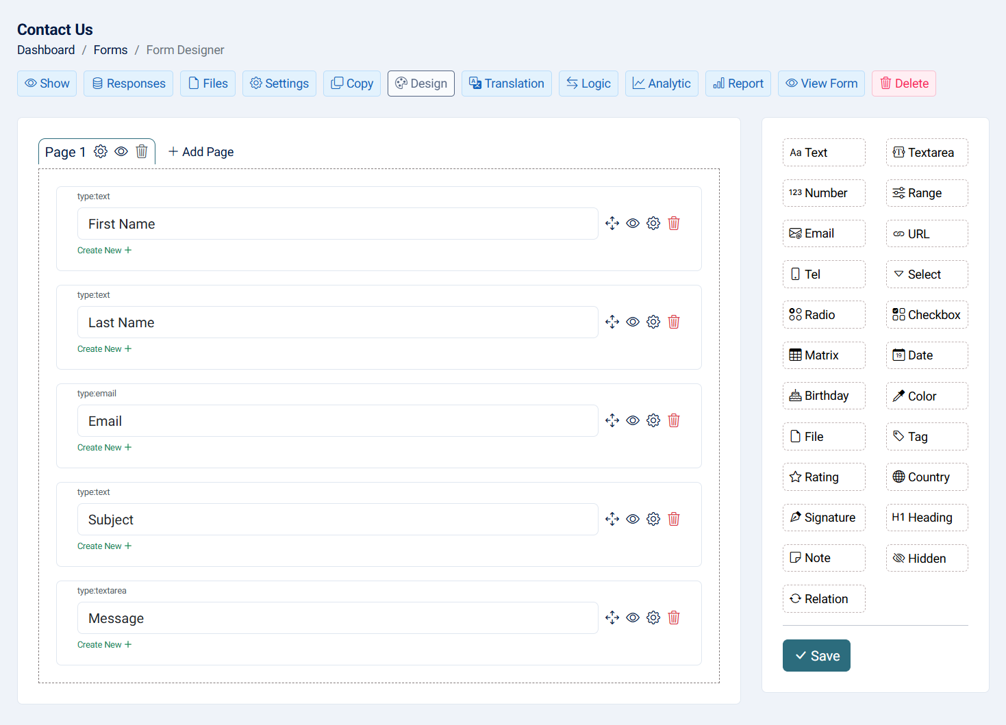 Upon creating a form, you will be redirected to the form designer to add fields. Each field have custom settings. After adding the fields, click on save, then view the form to see the form.