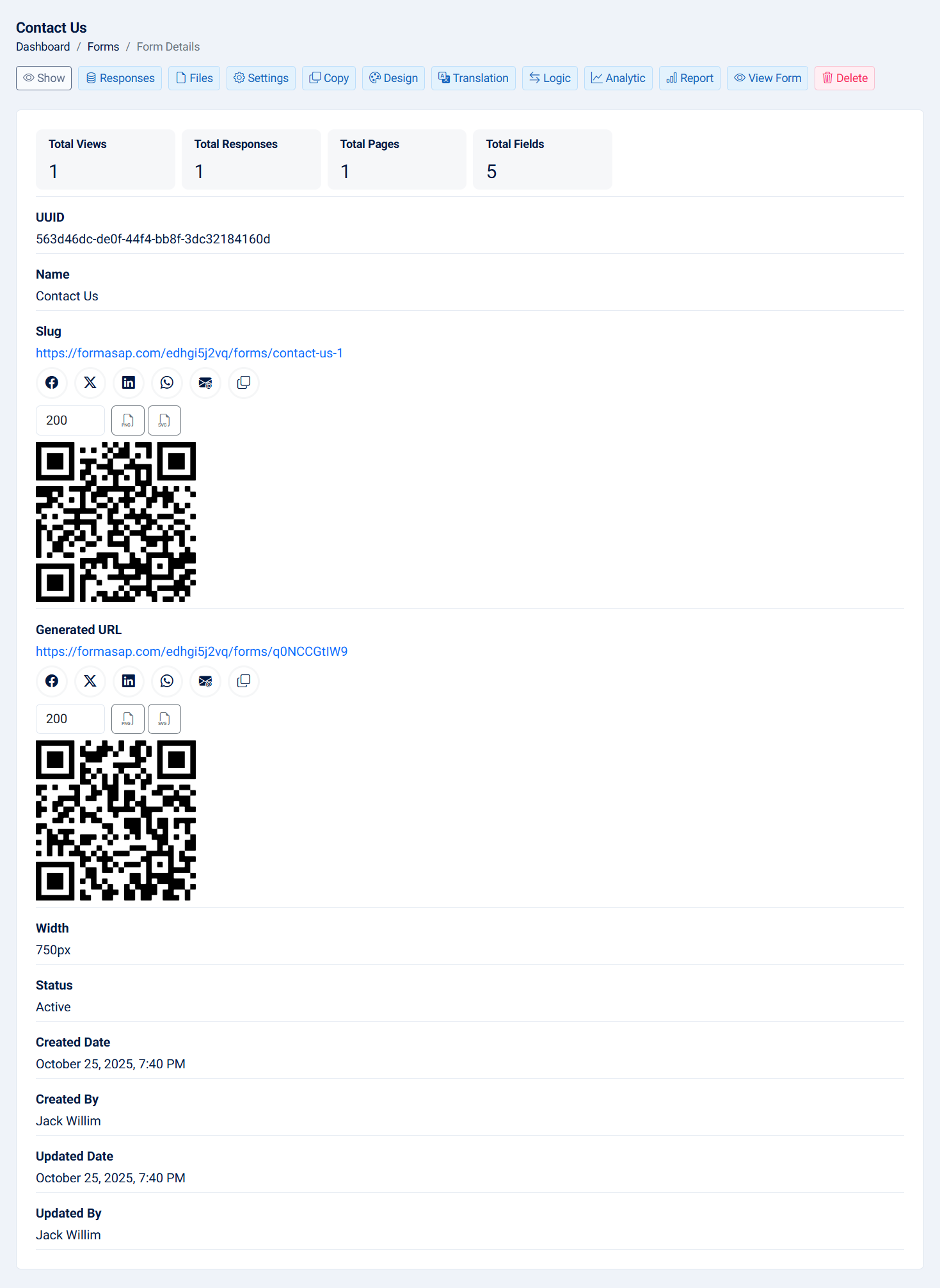 4- View: This action allows you to see the most important form details in addition to generating the QR code for both the slug and the generated URL.