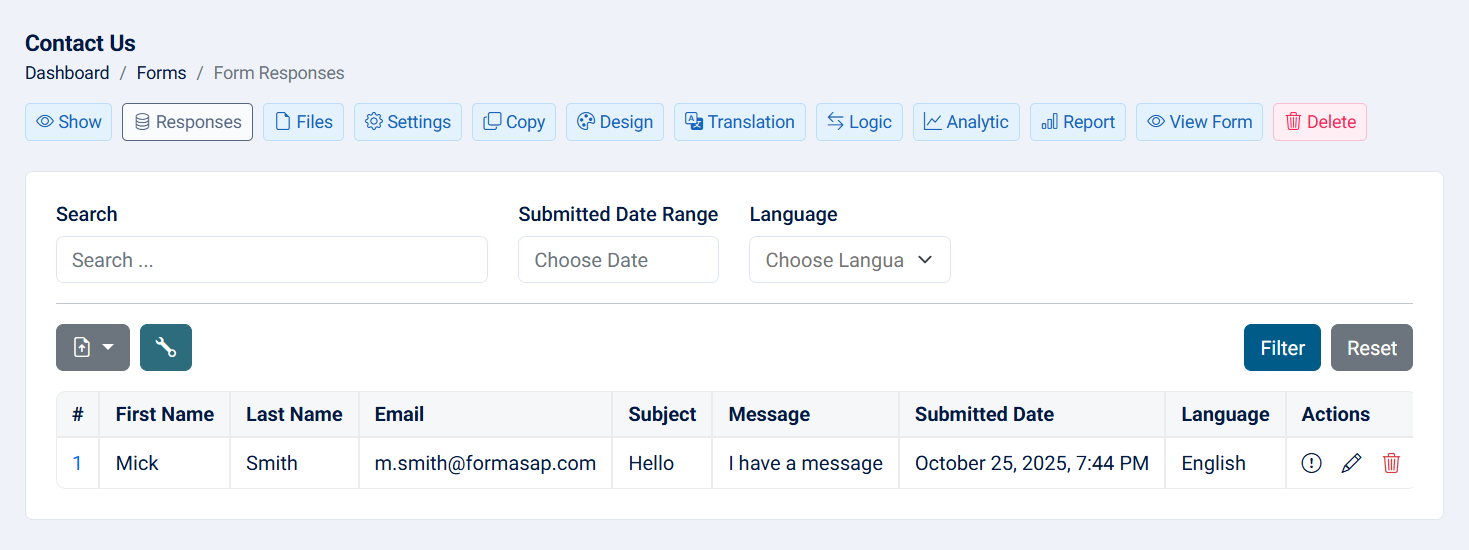 5- Responses: This action allows you to see the form responses with the ability to export data and customize the filter.