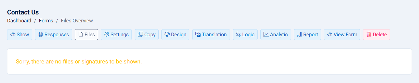 14- Delete: The delete action allows you to remove a form. When a form is deleted, all associated data, responses, files, logic, and any custom certificates, documents, or calendars will be deleted.