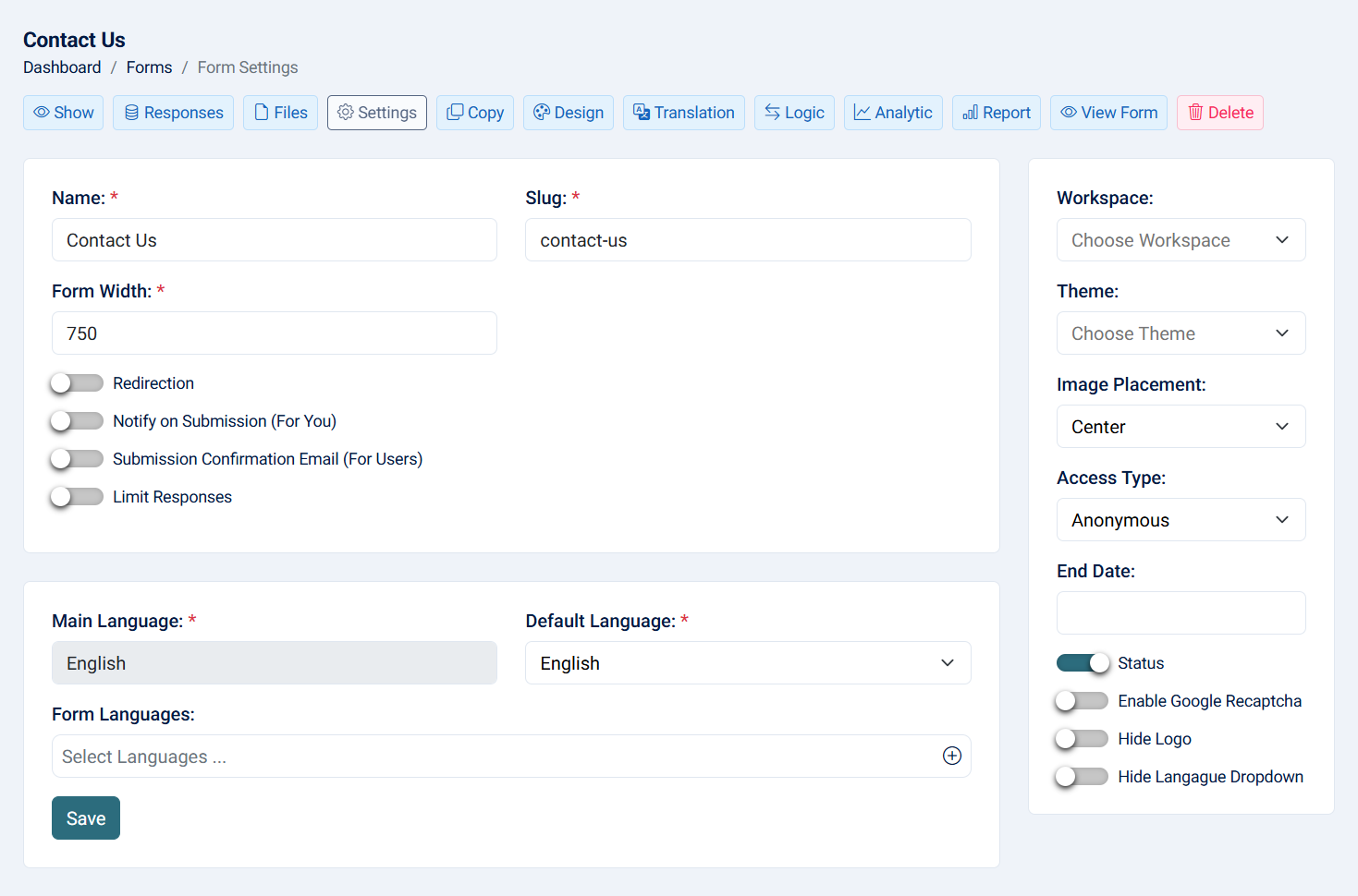 - Form Languages: When you select one or more languages, everything can be translated from the form's translation page, allowing you to create a multilingual form!