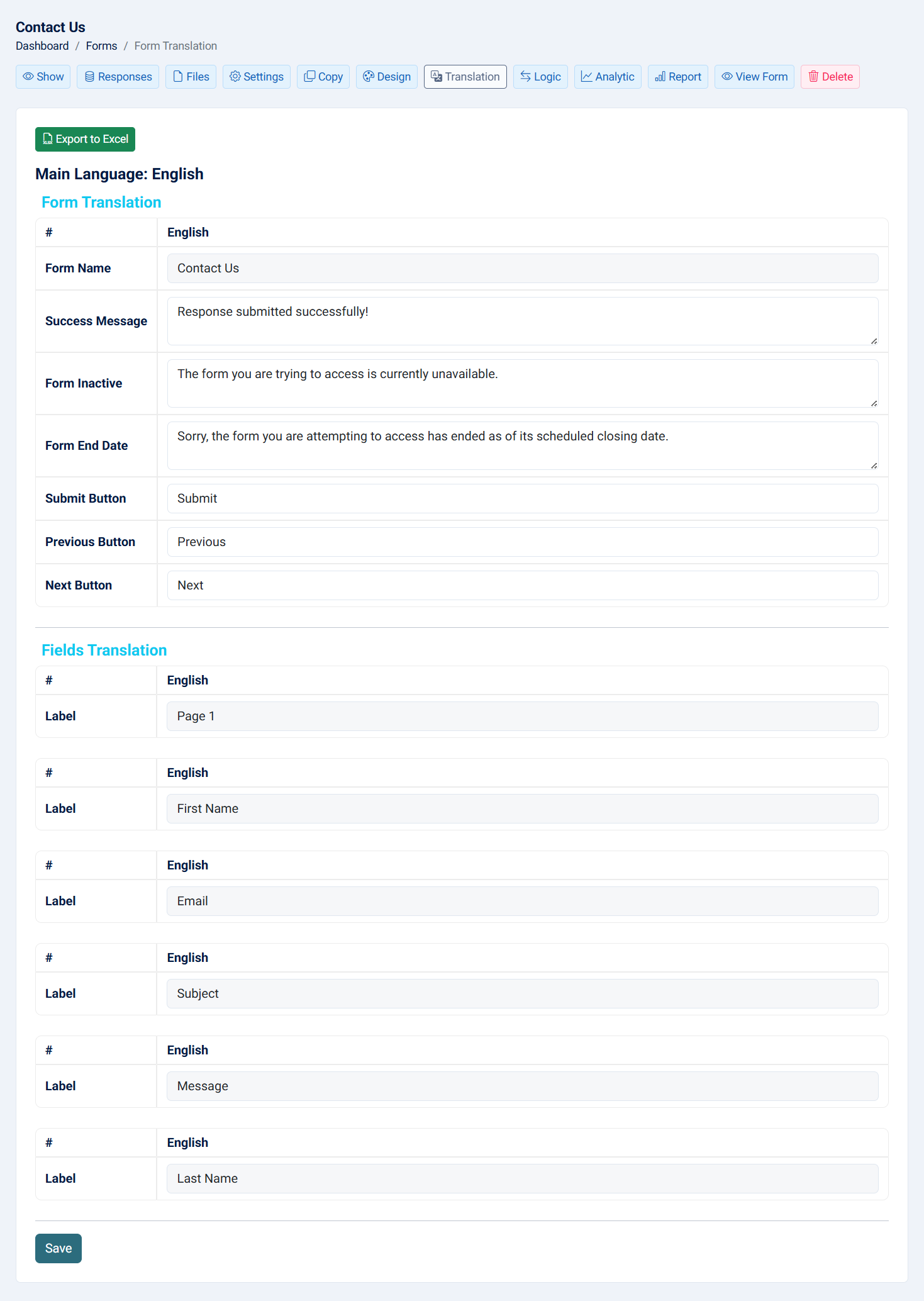 8- Translation: This action allows you to translate the form's default messages and field options, such as labels, placeholders, and more.