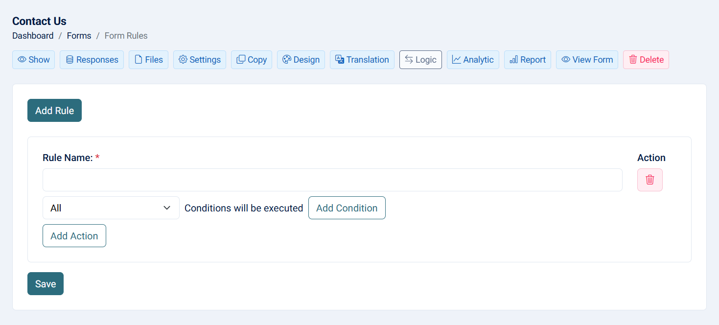 10- Rules: This action allows you to show or hide fields based on conditions and values. If the value of the condition is met, the target field will be shown or hidden.