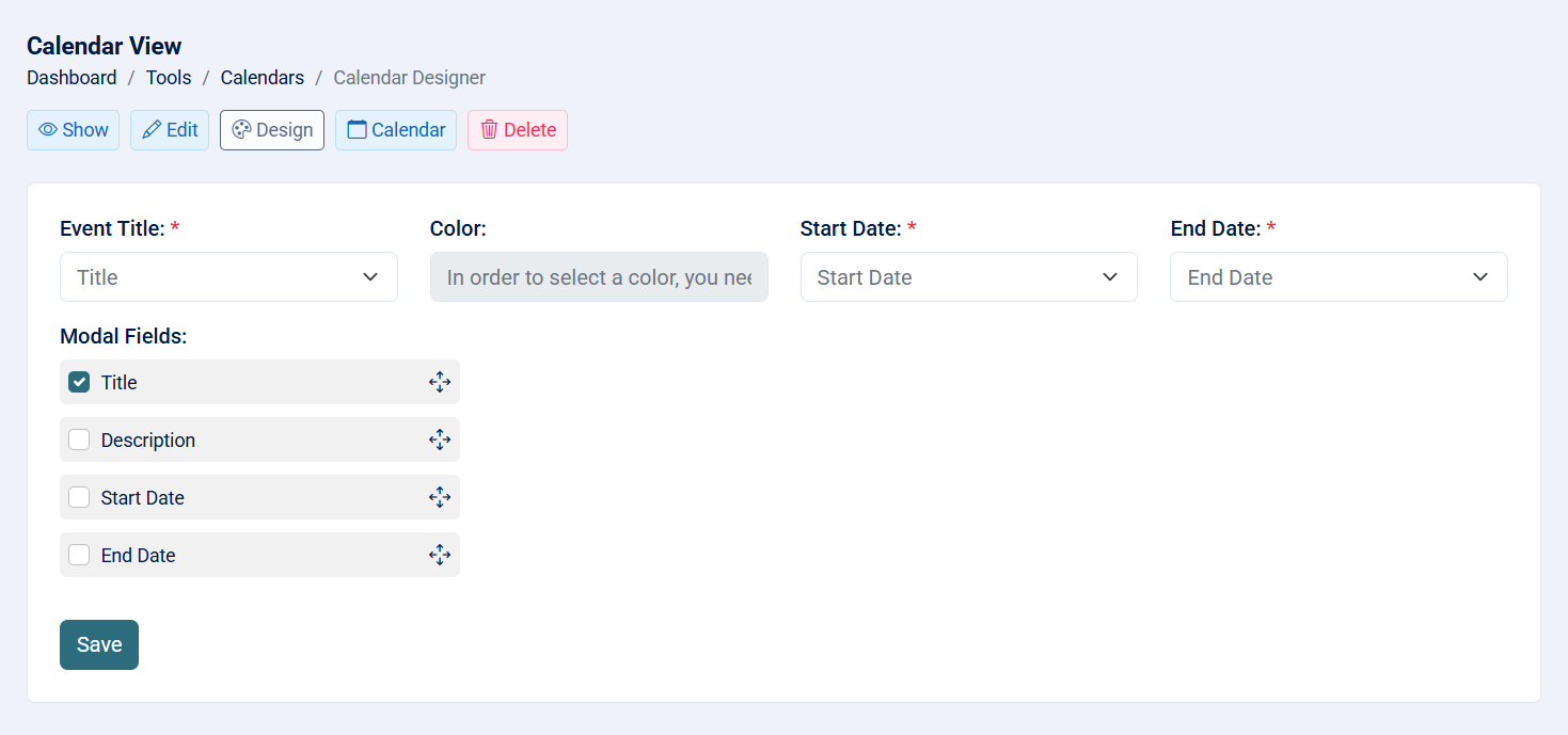 - Modal Fields: Select the fields you want to include when the user clicks on the event title. You can also change the order of these fields.