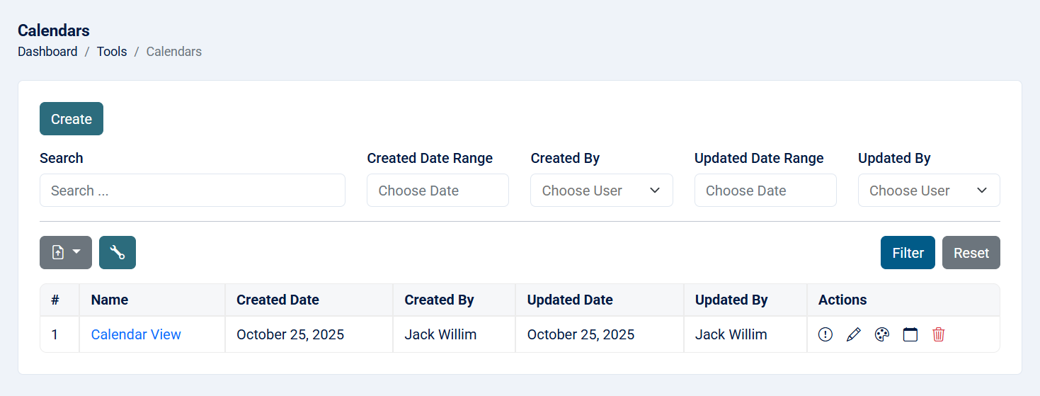 - Created Date: The created date of the calendar.