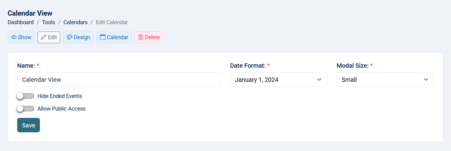 - Allow Public Access: If checked, the calendar view will be publicly accessible without requiring authentication. This is ideal when you want to share a calendar with others—such as sending a link to external users—without needing them to log in.