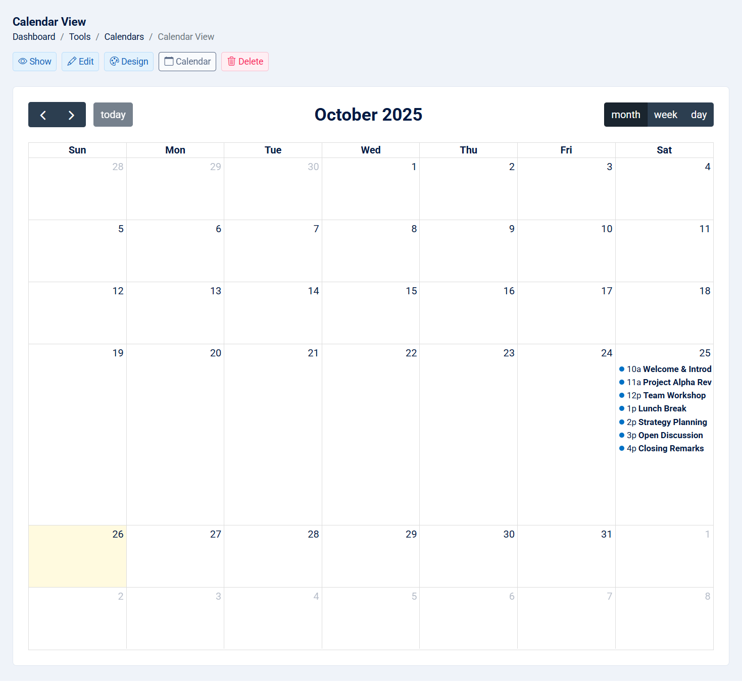 - Hide Ended Events: If checked, any finished events will not be rendered in the calendar view.