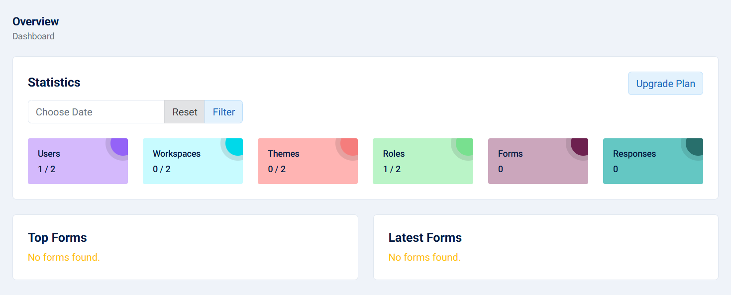 The date filter is connected with the statistic section, allowing you to filter by date. - Top Forms: Displays the top 5 forms that have received the most responses, highlighting the most engaged forms.